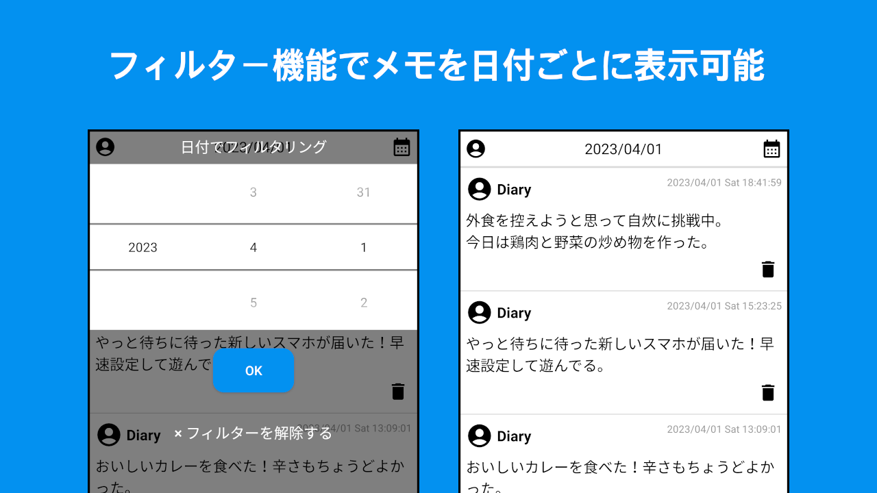 ・フィルター機能でメモを日付ごと表示可能。