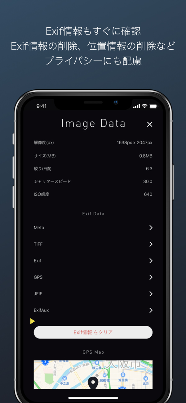 - Exif情報や位置情報の削除機能でプライバシーにも配慮