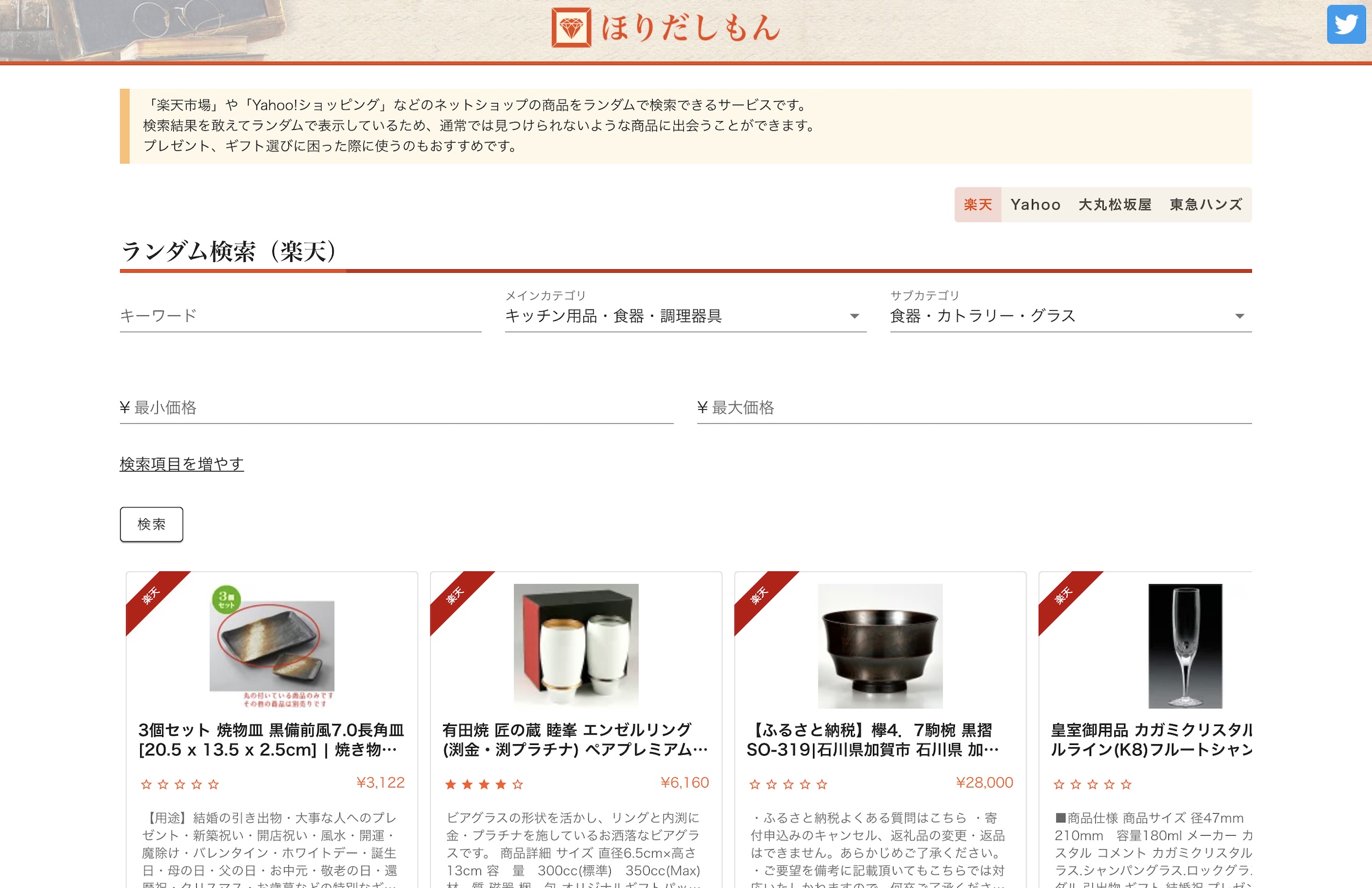 「楽天市場」や「Yahoo!ショッピング」などのネットショップの商品をランダムで検索できるサービスです。