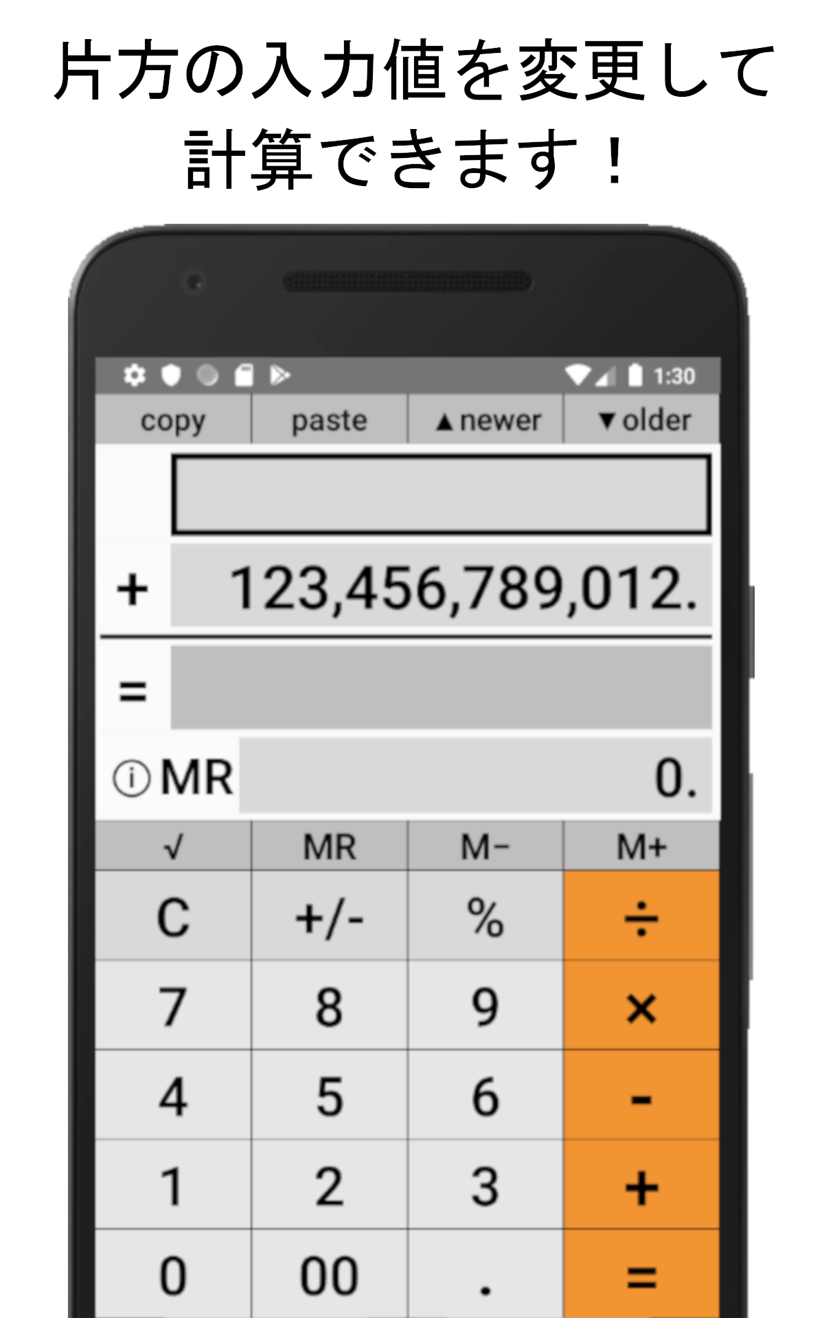 それから20年経ちましたが、いまだ複数の表示部を持つ電卓は少数派というか、ほぼ見当たりません。そこで20年前のパソコン用電卓をスマホ用に復活させ、さらに使いやすく改良を加えたのがこのアプリです。