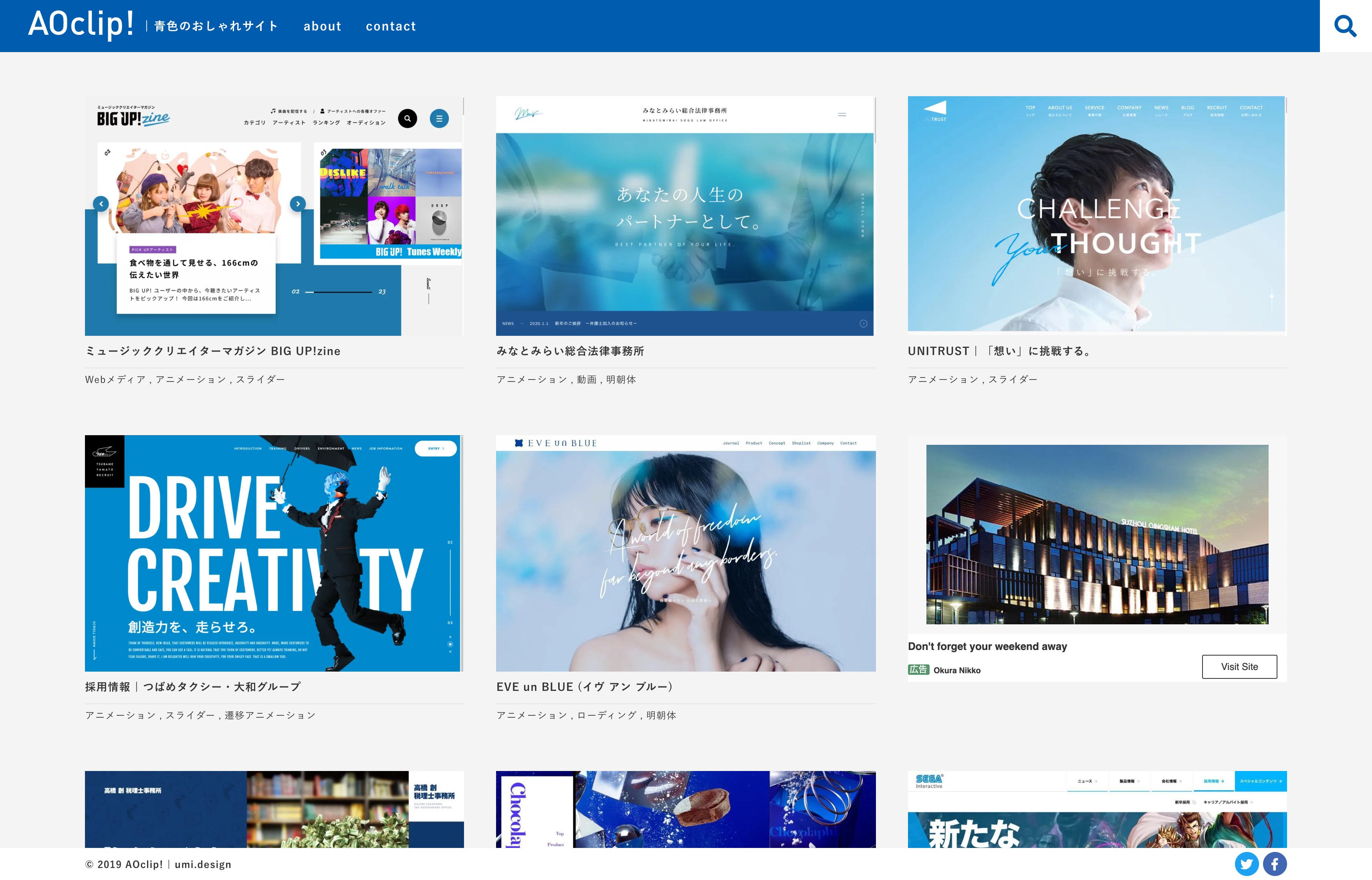 AOclip!は、青色のWebサイトに限定したギャラリーサイトとなっています。クオリティの高いおしゃれなサイトを掲載・紹介しています。