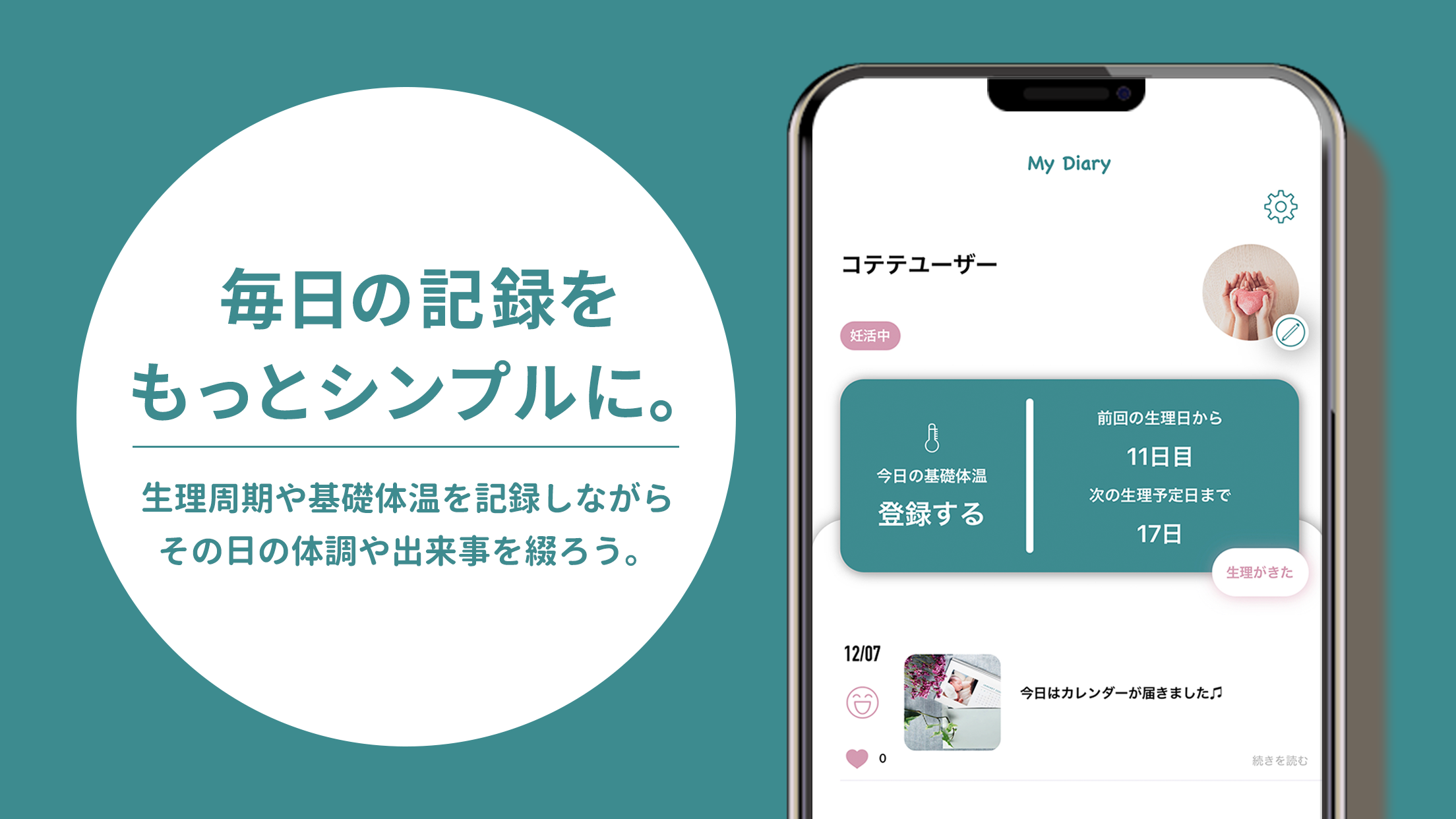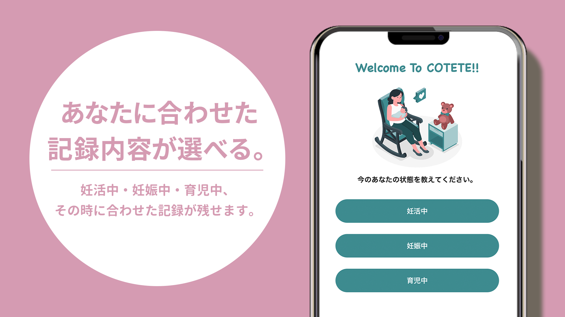 妊活から子育てまで、すべてのママさんたちの体調管理やなやみ、思い出をかんたんにCOTETE(コテテ)で解決できます。