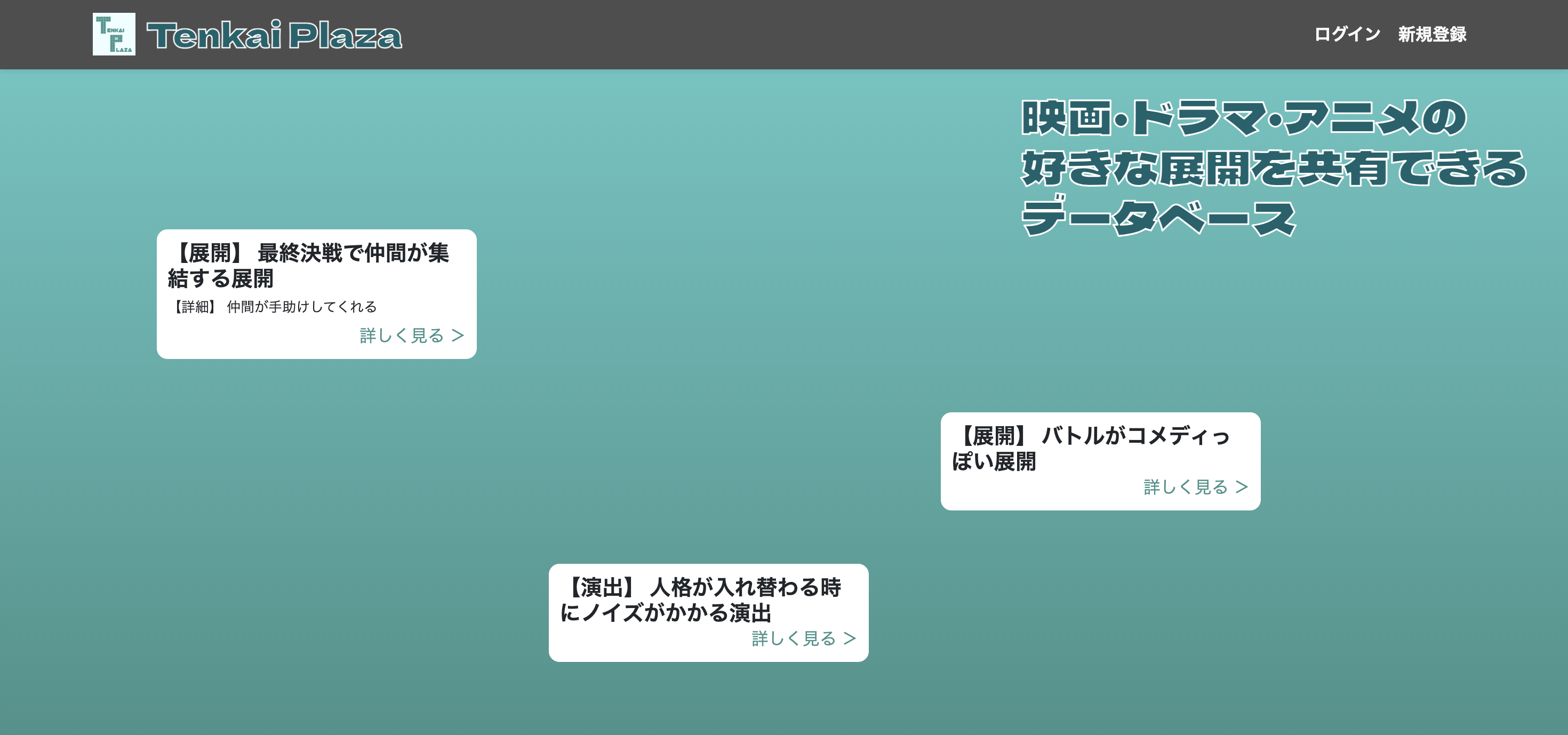 映画・ドラマ・アニメ・漫画・小説・ゲームなどのストーリーにおいて好きな展開や演出、キャラクター設定を共有できるサービス。