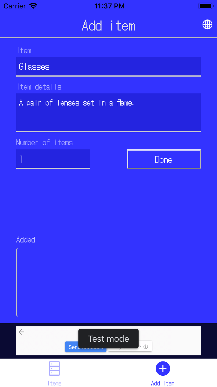 アイテムの追加画面で「アイテム名」「アイテムの詳細」「アイテムの個数」を入力して決定すると、アイテムリスト画面に反映されます。