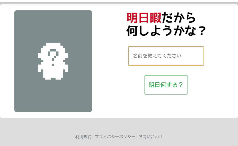 そんな暇な人が遊べるサイト、また遊びに誘ってほしい人が直接人に言えないけど何となく誘ってもらうためのきっかけのためのサイトになればいいと思っています。